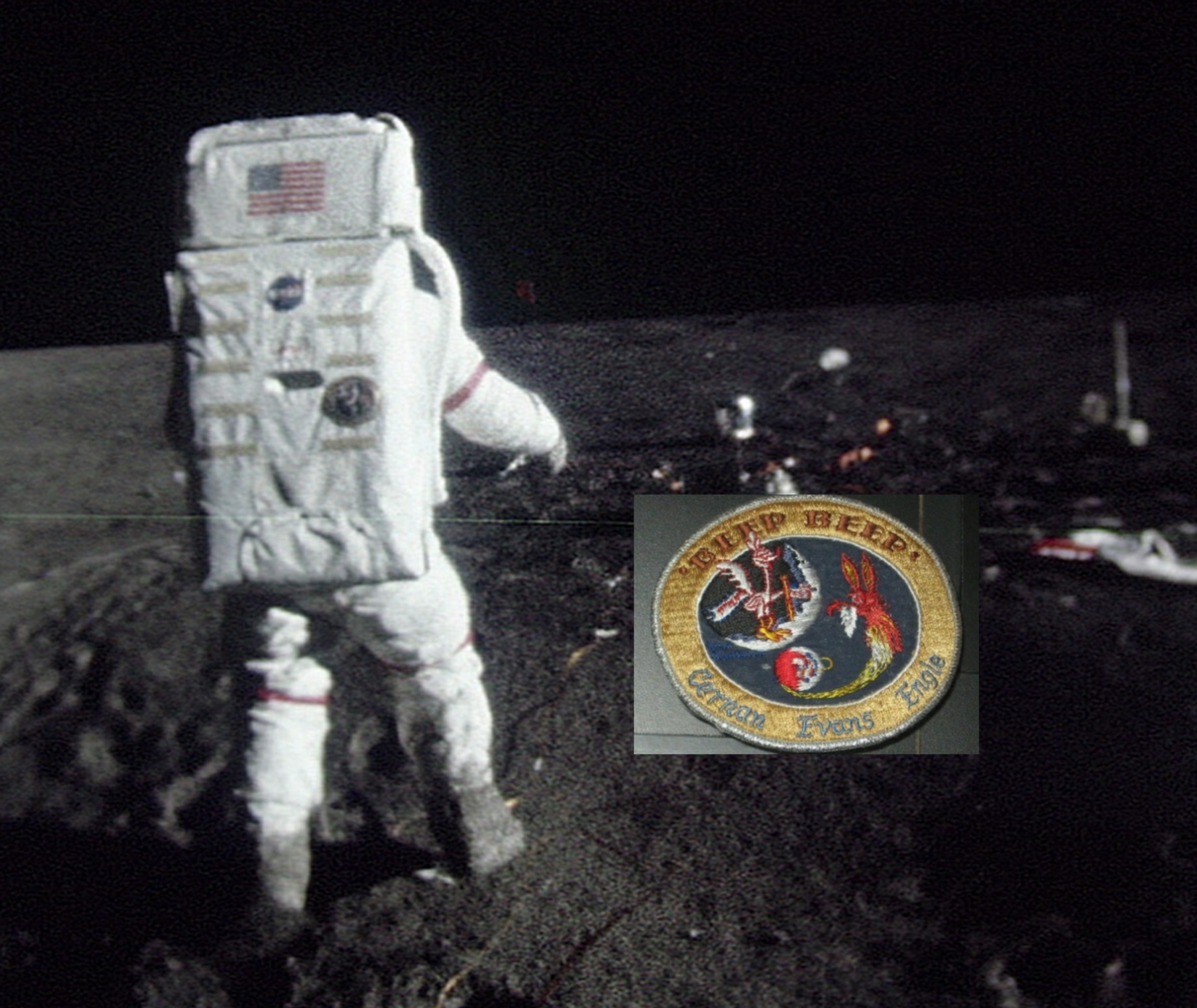 [Jones - "I had heard that the backup crew had put notes in lots of places on the spacecraft. Did you just find one on the MET?"][Mitchell - "I think what we're talking about there is one of their patches, because they put the goddamn things all over the spacecraft and, whenever we opened up something, there would be one of them. It had a Roadrunner on it and was a parody of our patch."]
