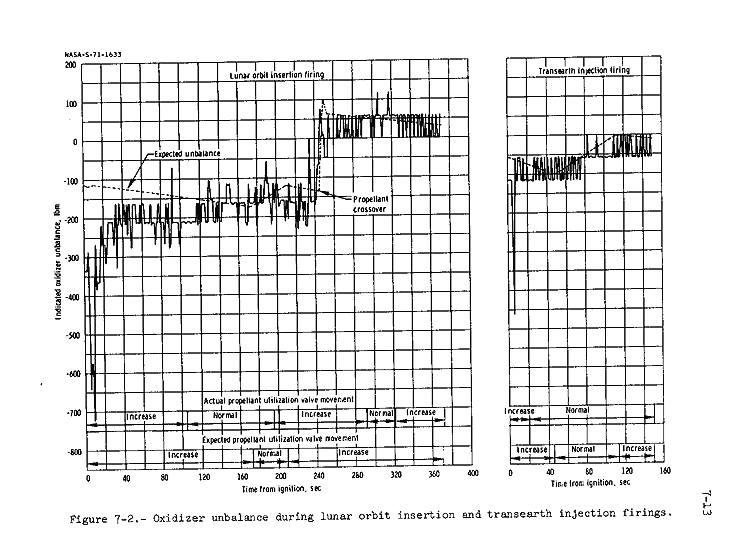 Figure 7-2 shows the variance in fuel and oxidizer remaining at any instant during the lunar orbit insertion and transearth injection firings, as computed from the telemetry data, and the propellant utilization valve movements made by the crew. The preflight expectedyalues and propellant utilization movements are also shown. The service propulsion system propellant usage for the mission is discussed in section 7.10-1.