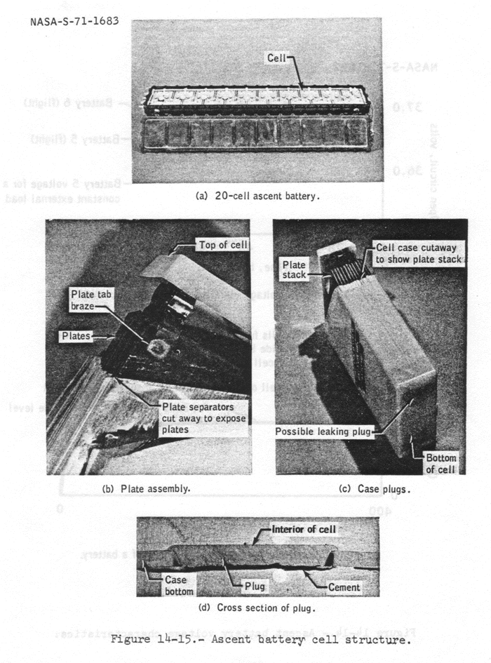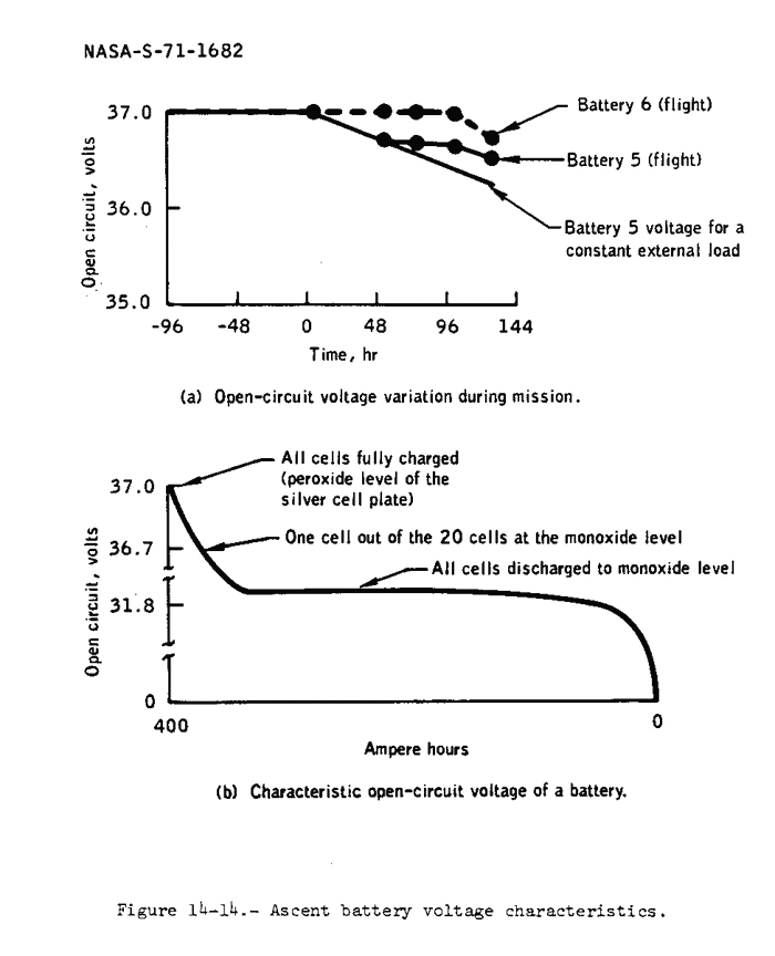 At 62 hours, the ascent battery 5 open-circuit voltage had decreased from a lift-off value of 37.0 volts to 36.7 volts instead of remaining at a constant level (fig. 14-14(a)). Figure 14-14(b) shows characteristic open-circuit voltages for a fully charged battery (peroxide level of all cells) and all cells operating on the monoxide level of the silver plate. Note that one cell at the monoxide level and the remaining 19 at the peroxide level would have caused the observed open-circuit voltage of 36.7 volts.