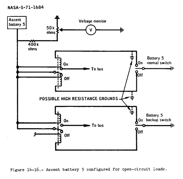 An external battery load could have existed from lift-off to 62 hours on the circuit shown in figure 14-16 in which typical types of high resistance shorts are also shown. For this condition, the current drain would have occurred on all cells. Figure 14-14 shows the time history of the open-circuit bus voltage for battery 5. For a constant external load, the battery 5 open-circuit bus voltage would have been lower than the flight data at 141 hours. Therefore, the external load would have had to change with time.