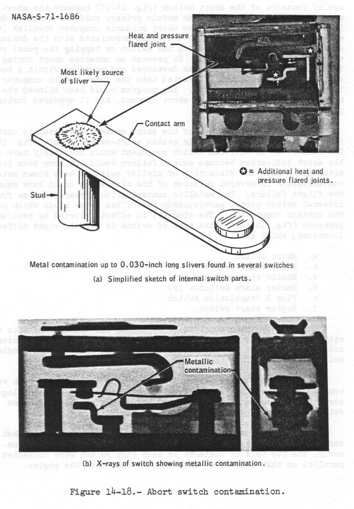 Prior to descent, the primary guidance computer received an abort command four different times. The computer would have reacted if the descent program had been initiated. The failure was isolated to one set of contacts of the abort switch (fig. 14-17) because the abort command appeared only on the lunar module primary guidance computer downlink (telemetry) and not on the abort guidance computer downlink (telemetry) or the telemetry bilevel discretes associated with the descent engine control logic. Recycling the switch or tapping the panel removed the signal from the computer. To prevent an unwanted abort during powered descent, a computer program was developed and verified within 2 hours, and in time to be manually inserted into the lunar module computer prior to powered descent initiation. The program would have allowed the lunar module computer to ignore the abort command, had it appeared during powered descent.