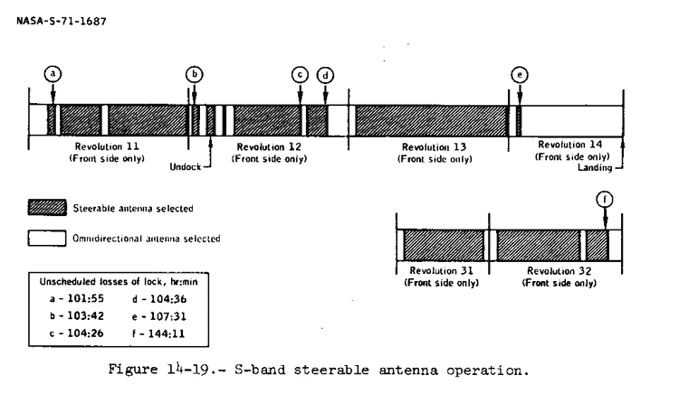 Prior to the descent phase of the mission, the S-band steerable antenna operation was intermittent. There were nine instances of unscheduled interruption of antenna tracking. Three of these have been explained. One was caused by the crew switching to an omnidirectional antenna because of an erroneous reading of the pitch position indicator at full scale of 255 degrees when the antenna was actually at 122 degrees. Another occurred because the antenna was in the manual slew mode and not in automatic-track. After undocking, the lunar module attitude was changed and, as a result, the antenna was pointed away from the earth resulting in a loss of signal. The third interruption which has been explained was caused by a failure in the ground station power amplifier resulting in a temporary loss of uplink signal.