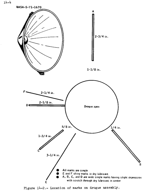 a. The probe status talkback displays functioned properly before and after the unsuccessful attempts, thus indicating proper switch operation and power to the talkback circuits. The talkback displays always indicated that the capture latches were in the cocked position during the unsuccessful attempts (fig. 14-1). (Note that no electrical power is required to capture because the system is cocked prior to flight and the capture operation is strictly mechanical and triggered by the drogueb. Each of the six marks on the drogue resulted from separate contacts by the probe head (fig. 14-2). Although three of the marks are approximately 120 degrees apart, a docking impact with locked capture latches should result in three double marks (to match the latch hooks) 120 degrees apart, and within one inch of the drogue apex or socket. Although the drogue marks could indicate that the individual capturelatch hooks were difficult to depress, such marks are not abnormal for impact velocities greater than 0.25 feet per second.