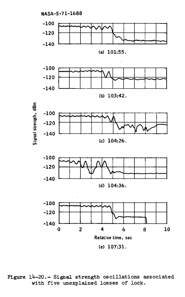 The remaining unexplained tracking interruptions (fig. 14-19) have similar characteristics. Five tracking interruptions occurred during Goldstone coverage and figure 14-20 is a plot of ground-station-received signal strengths at these times. During the Madrid ground station coverage of revolution 32, another incident was noted with the same type of antenna response. It indicates that the antenna began to experience a mechanical oscillation of approximately 2 to 3 hertz, which became increasingly larger in amplitude until the antenna lost lock. When antenna oscillations exceed plus or minus 5 degrees, excessive motor drive current causes the 28-volt dc circuit breaker to open and the antenna ceases to track. The crew reset this circuit breaker several times. The antenna was also reported to be noisy, indicating the continual driving that would have occurred during the oscillations. The oscillations occurred randomly at other times during the problem period, but damped out and did not cause tracking interruptions.