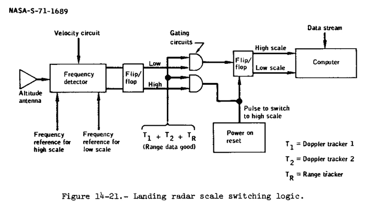 Two conditions occurred during the landing radar operation which were not expected; however, they were not abnormal. The first condition occurred approximately 6 minutes after initial actuation of the landing radar. The system switched to the low-range scale, forcing the trackers into the narrow-band mode of operation. This was corrected by recycling the main power circuit breaker which switched the radar to high scale. Figure 14-21 shows the radar scale switching logic. The radar then locked on and "velocity-data-good" and "range-data-good" indications were transferred to the computer. The "velocity-data-good" signal is generated when the Doppler trackers lock on and the "range-data-good" signal is generated when the range tracker also locks on.