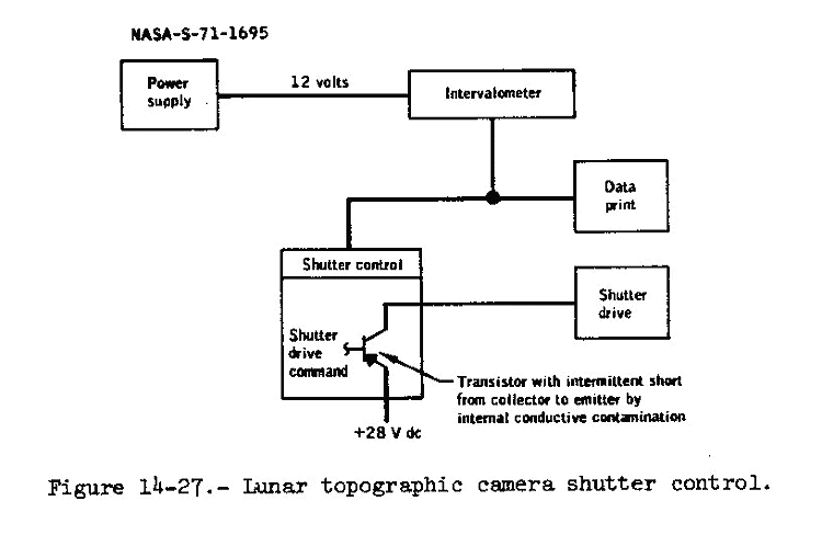 Postflight tests with the flight camera showed satisfactory operation in all simulated environments (pressure, thermal-, and vibration) at one-g. An intermittent failure was found in a transistor in the shutter control circuit (fig. 14-27). The transistor was contaminated with a loose piece of aluminum 0.130 inch by 0.008 inch, which was foreign to the transistor material. With a shorted tra~sistor, 28 volts is applied continuously to the shutter drive circuit, causing continuous shutter operation, independent of the intervalometer and independent of the single, auto, or standby mode selections. The sprocket holes in the 1/200 slot in the shutter curtain were torn as a result of the prolonged, continuous, high-speed shutter operation (fig. 14-28).