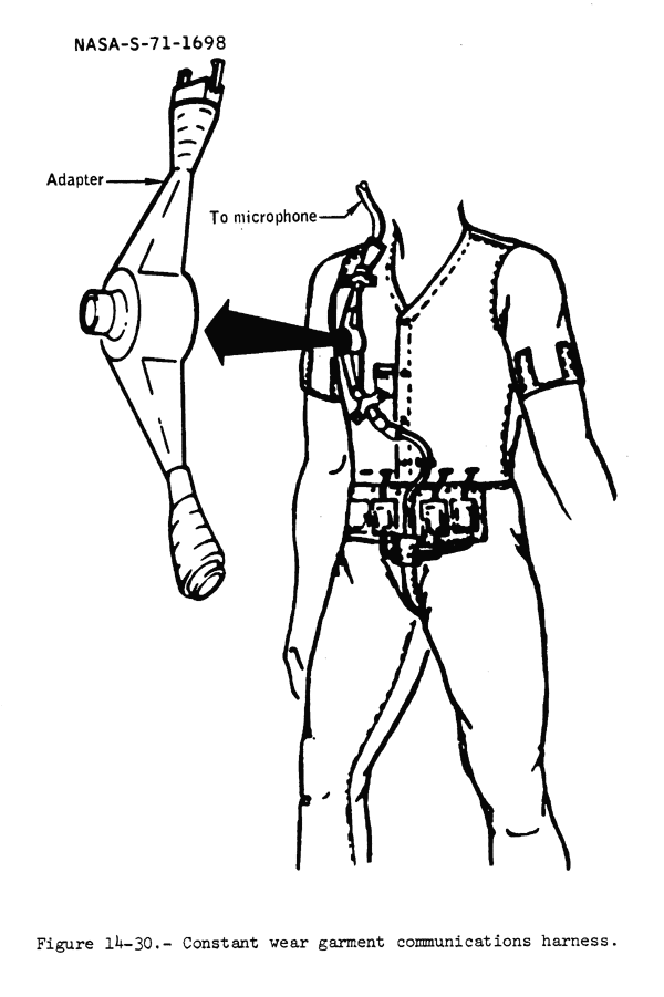 At approximately 29 hours, Mission Control had difficulty in communicating with the Commander. The Commander replaced his constant wear garment electrical adapter (fig. 14-30) with a spare unit, and satisfactory communications were reestablished.