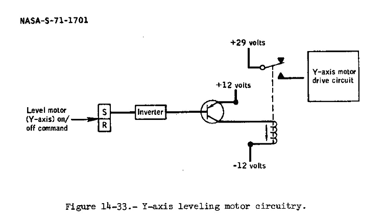 The horizontal Y-axis leveling motor of the gimbal leveling system operates intermittently (fig. 14-33). Although a command verification is received when commands are sent, power is not necessarily received by the motor. When there is an indication of power to the motor, the motor does operate. As a result, during the first lunar day, response to ground commands was normal except for 6 of the 22 commands when there was no response.