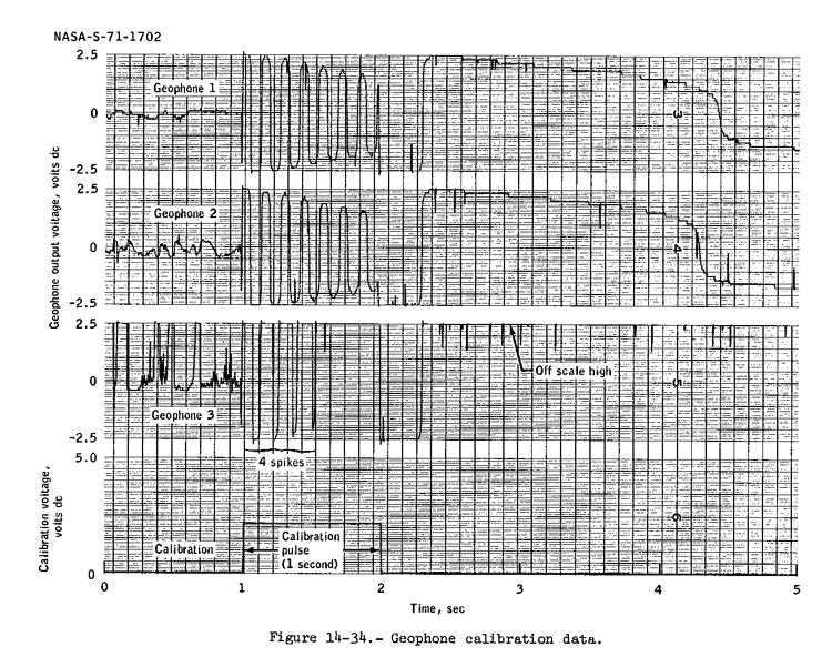 The experiment was turned on in the listening mode on March 26, 1971, and geophone 3 data were spiking off-scale high (fig. 14-34). When the geophone channels were calibrated, the geophone 3 channel went off-scale high simultaneously with the start of the calibration pulse and stayed off-scale high for the remainder of the listening period. During the 1-second period when the calibration pulse was present, data from geophones 1 and 2 showed the normal 7-hertz ringing caused by the calibration Dulse. However, geophone 3 data showed four negative-going spikes coincident with the first four negative half cycles of the ringing on the other two channels. The spikes decreased in duration from the first to the last, the last having an amplitude of 90 percent of full scale (plus 2.5 volts to minus 2.0 volts). During the time that this pulse was present, the signal on channel 2 changed from minus 2.2 volts to minus 2.35 volts, indicating that channel 3 was operating at an apparent gain of 30 times the channel 2 gain.