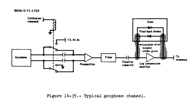 There are 10 such solder joints for each geophone (fig. 14-36): four on the oven terminal board, four on the mother board, one on the top board of the log compressor module, and one on the bottom board of the log compressor module. The one most likely to fail first is on the top board of the log compressor module. Continuity at the joint recovers as long as the crack closes during the lunar day.