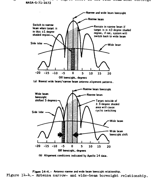 a. 76:45:00 to 76:55:00An instrumentation problem with the antenna readout occurred for about 3 hours early in the mission when an error of about 30 degrees existed. Subsequently, the readings were normal. A mechanical interference in the instrument servos is the most likely cause. The instrument servos are an independent loop which drive the antenna pitch and yaw meters in the command module. No corrective action is planned since the servos do not affect the antenna performance for any modes of operation.b. 92:16:00 to 93:22:00