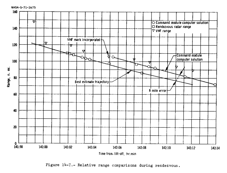 Prior to lunar descent, the VHF ranging and rendezvous radar range measurements correlated closely. However, during the time period preceding terminal phase initiation, the VHF ranging system indicated erroneous measurements. During this same time period, numerous range tracking dropouts also occurred. The range measurements were in error by 5 to 15 miles when compared with the rendezvous radar range measurements (fig. 14-7). The VHF ranging data presented in the figure results from a number of different acquisitions. After terminal phase initiation, the signal strength, as indicated by the lunar module receiver automatic gain control voltage measurement, was adequate and VHF ranging operation was normal.