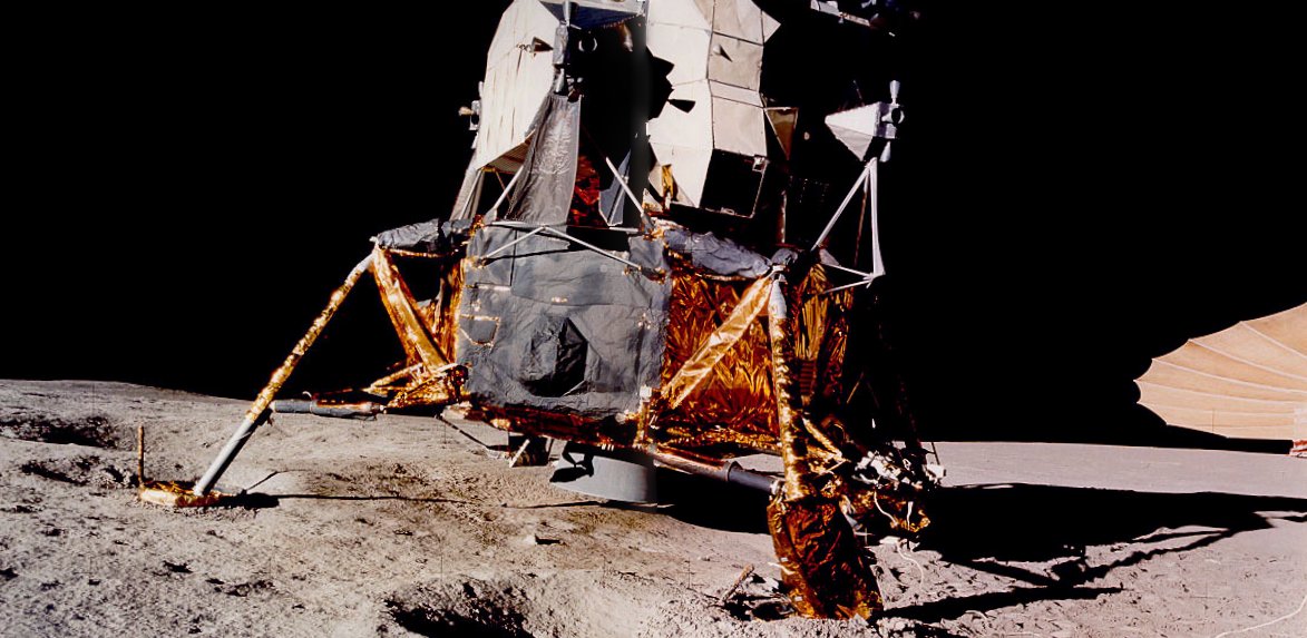 The lightweight construction of the LM is apparent in this picture. Minor buckling of panels covering the aft equipment bay and right side of the LM are visible. Notice also thermal damage done to the RCS plume deflectors. The extensive use of gold tape to secure the black insulation blankets can be seen.