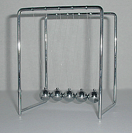 P = 0.5 * ( P1 + P2) = 0.5 * P1 .In essence, we have a simple pendulum of length L1 that 'bounces' off B and completes only half a period on each swing.To illustrate let us consider a widely available science toy - usually called a Newton's Cradle - which consists of a framework from which a number of steel balls are suspended in a line by pairs of threads so that the balls are just touching or close to touching their neighbors. In the usual demonstration, one of the end balls is raised and then released. Once it strikes the first stationary ball, the collision is transmitted down the line and, almost without delay, a single ball flies up from the opposite end, and so on. If, however, we raise one ball at each end and release them simultaneously, they strike the line of stationary balls simultaneously and, almost immediately, fly back out again. From a practical perspective, the period is halved.