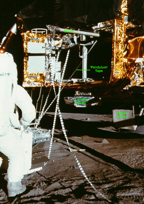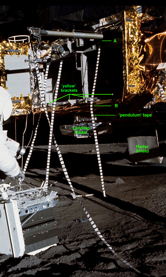 A detail from Apollo 12 photograph AS12-46-6785 shows the tape after Al released it. Note that the portion below the bottom edge of the SEQ Bay (point B) appears to have gone past vertical and that this tape, like its Apollo 14 counterpart, is swinging. Unfortunately, we have no TV of the Apollo 12 ALSEP offload.