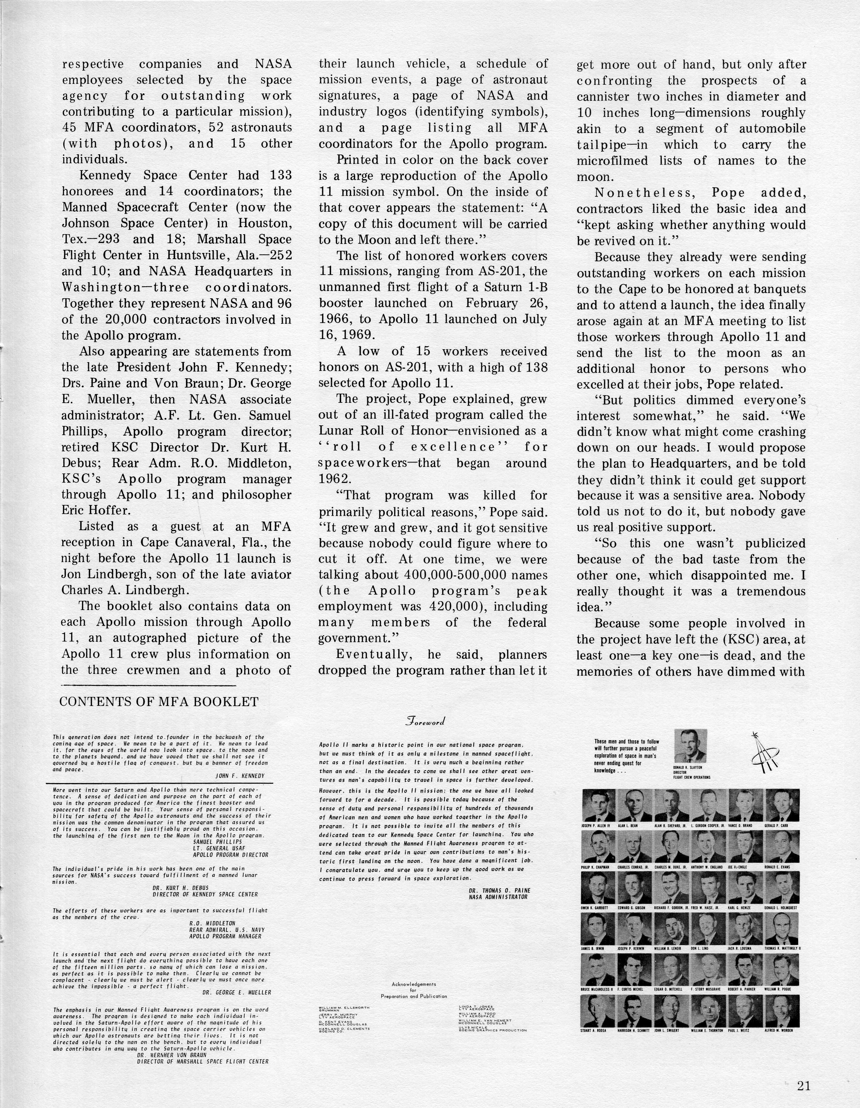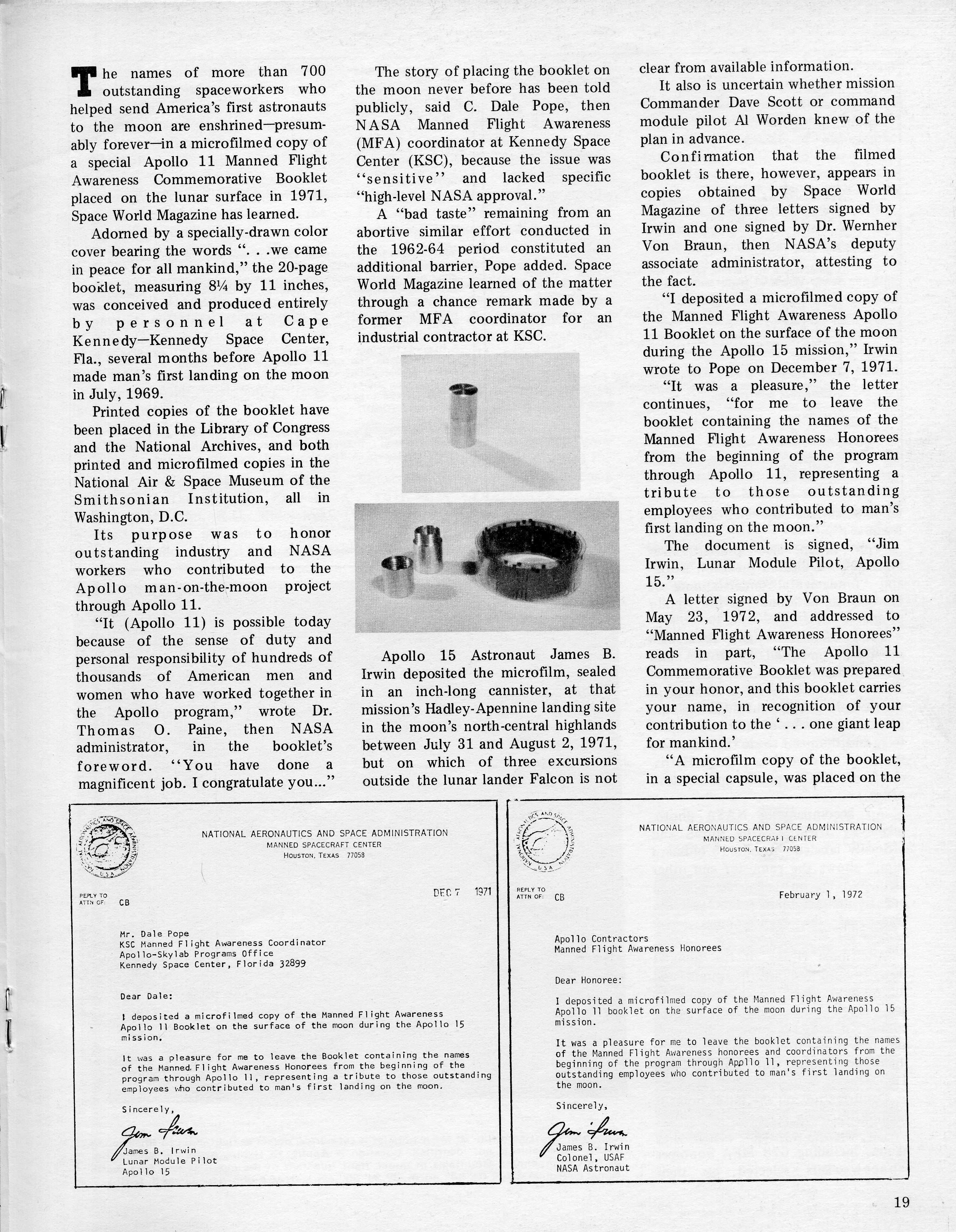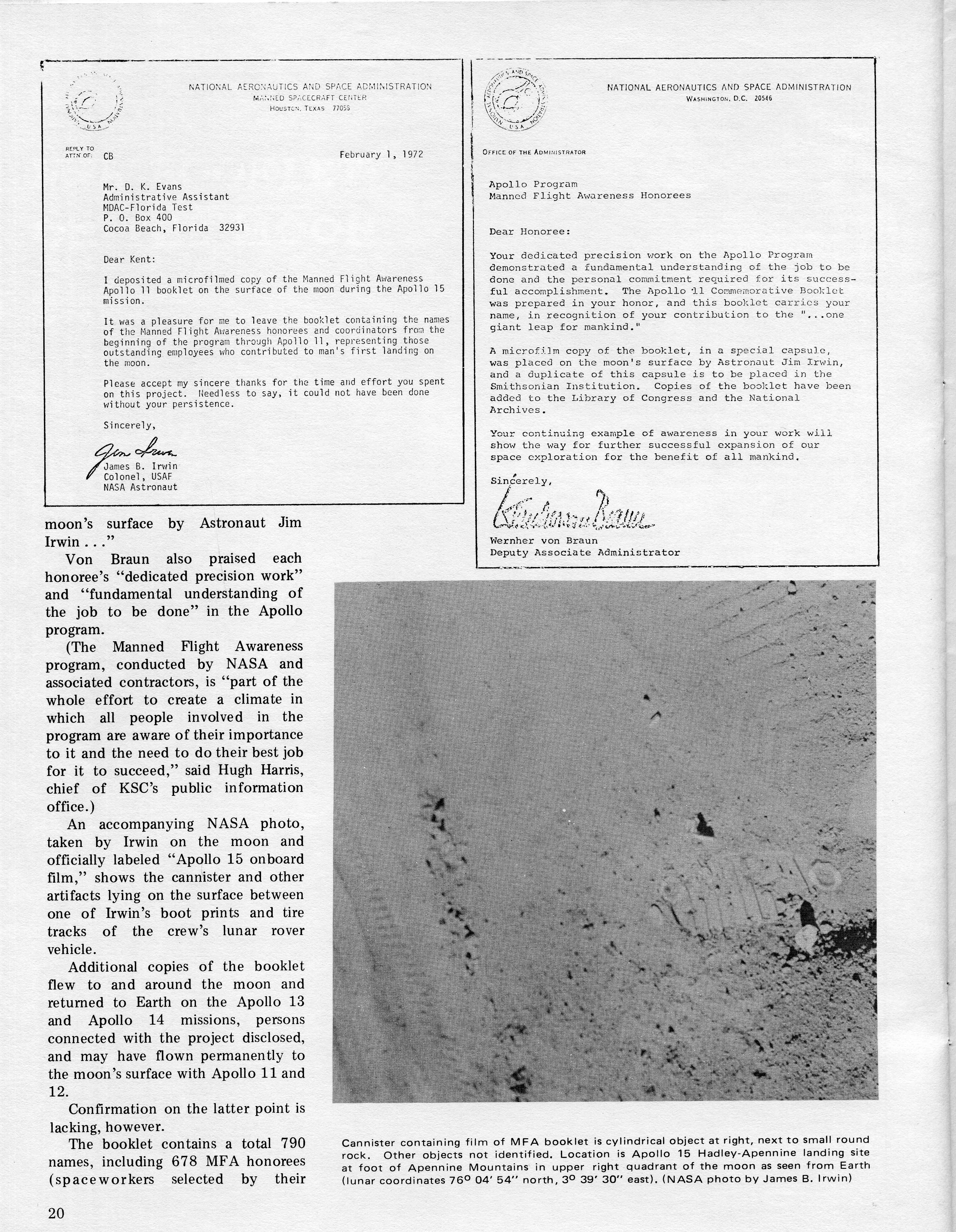 The MFA booklet was produced at the Kennedy Space Center "several months before Apollo 11 ... to honor outstanding industry and NASA workers who contributed to the Apollo man-on-the-moon project through Apollo 11." The article linked below was written by Jerry Lipman and appeared in the December 1976 issue of Space World Magazine. It reproduces the booklet and details how Jim Irwin deposited a microfilm copy of the MFA Booklet on the Moon during Apollo 15. The article is reproduced with permission from the author. Scans provided by Joel Powell. See, also, the discussion related to photos Jim took of the microfilm canister and other memorial items, A15-88-11867 to 11871.