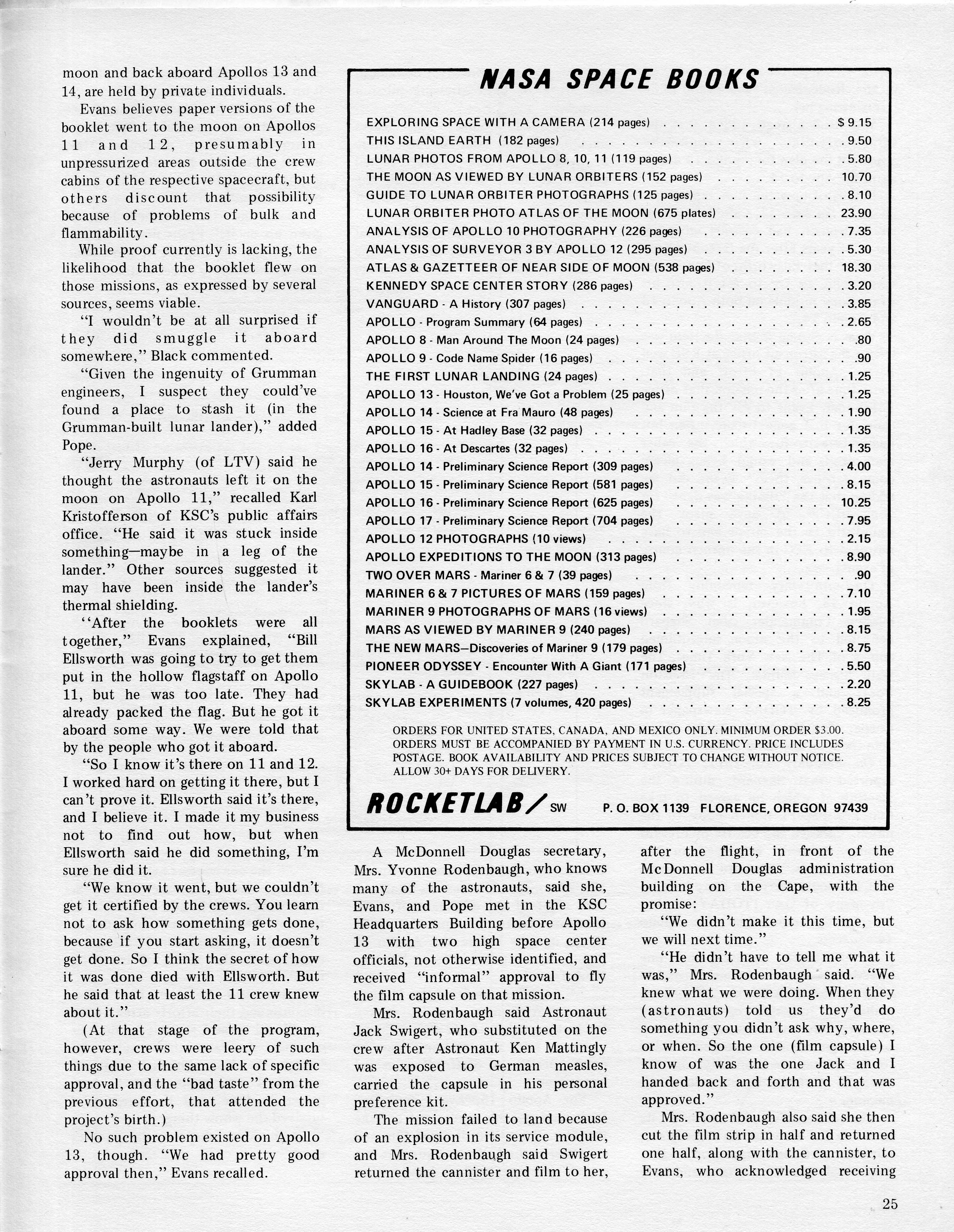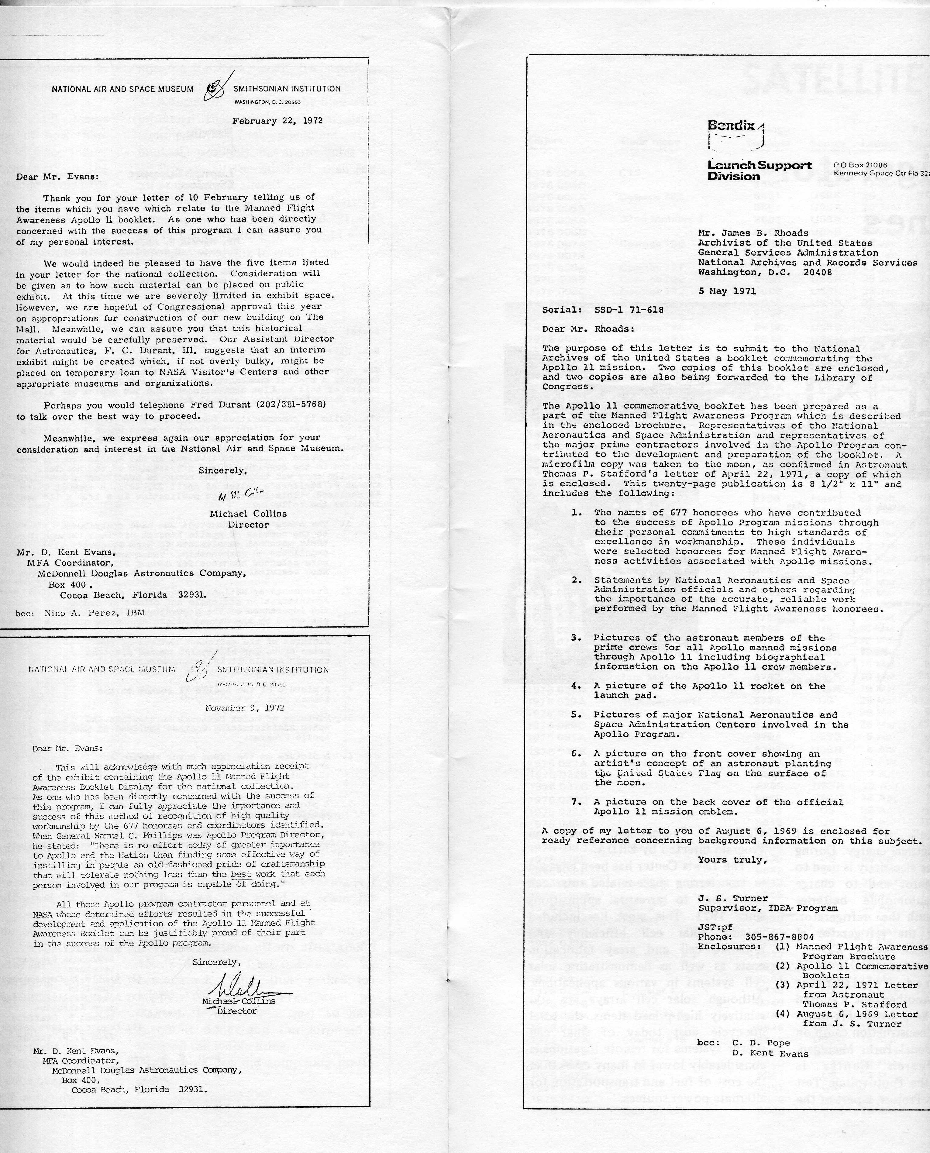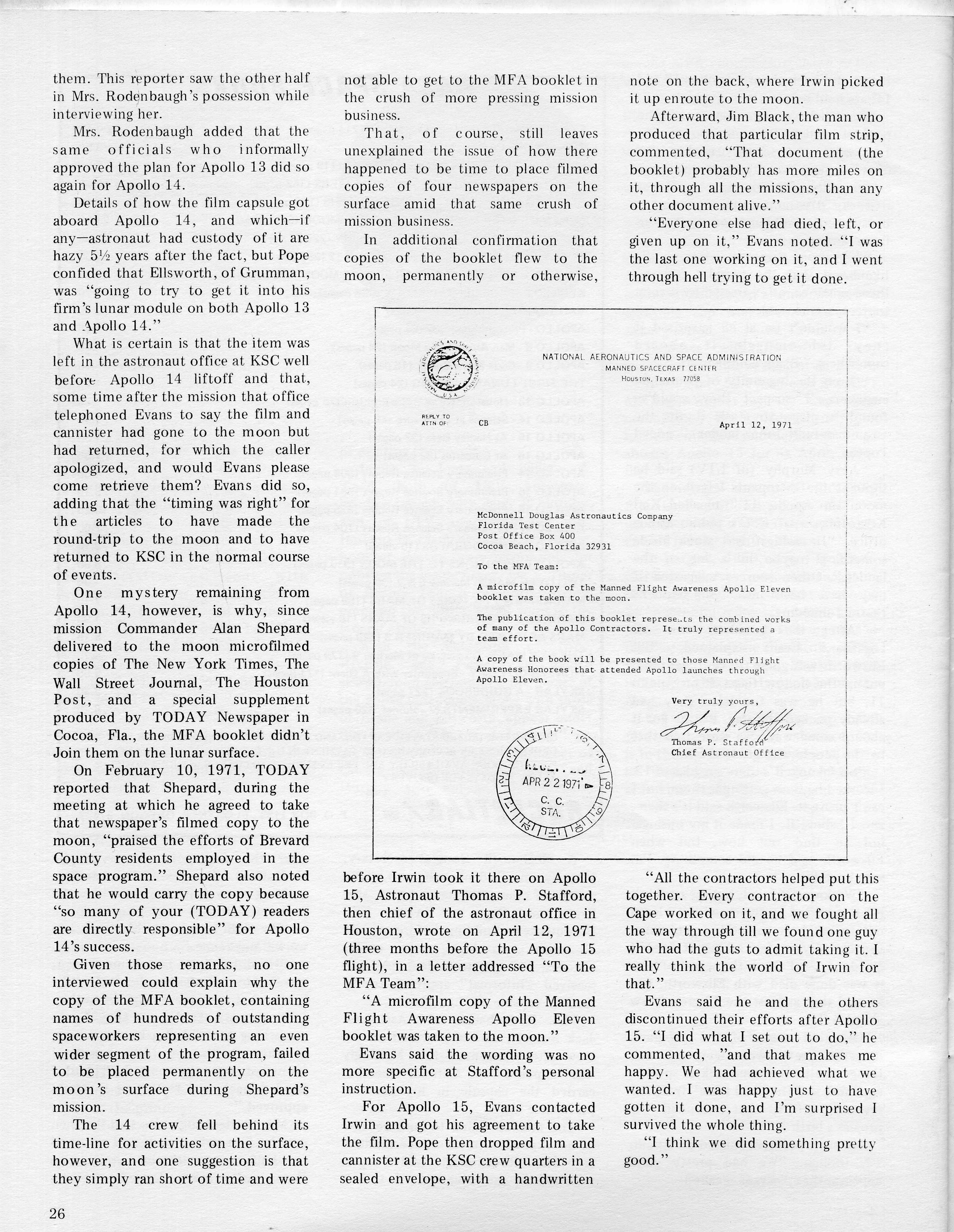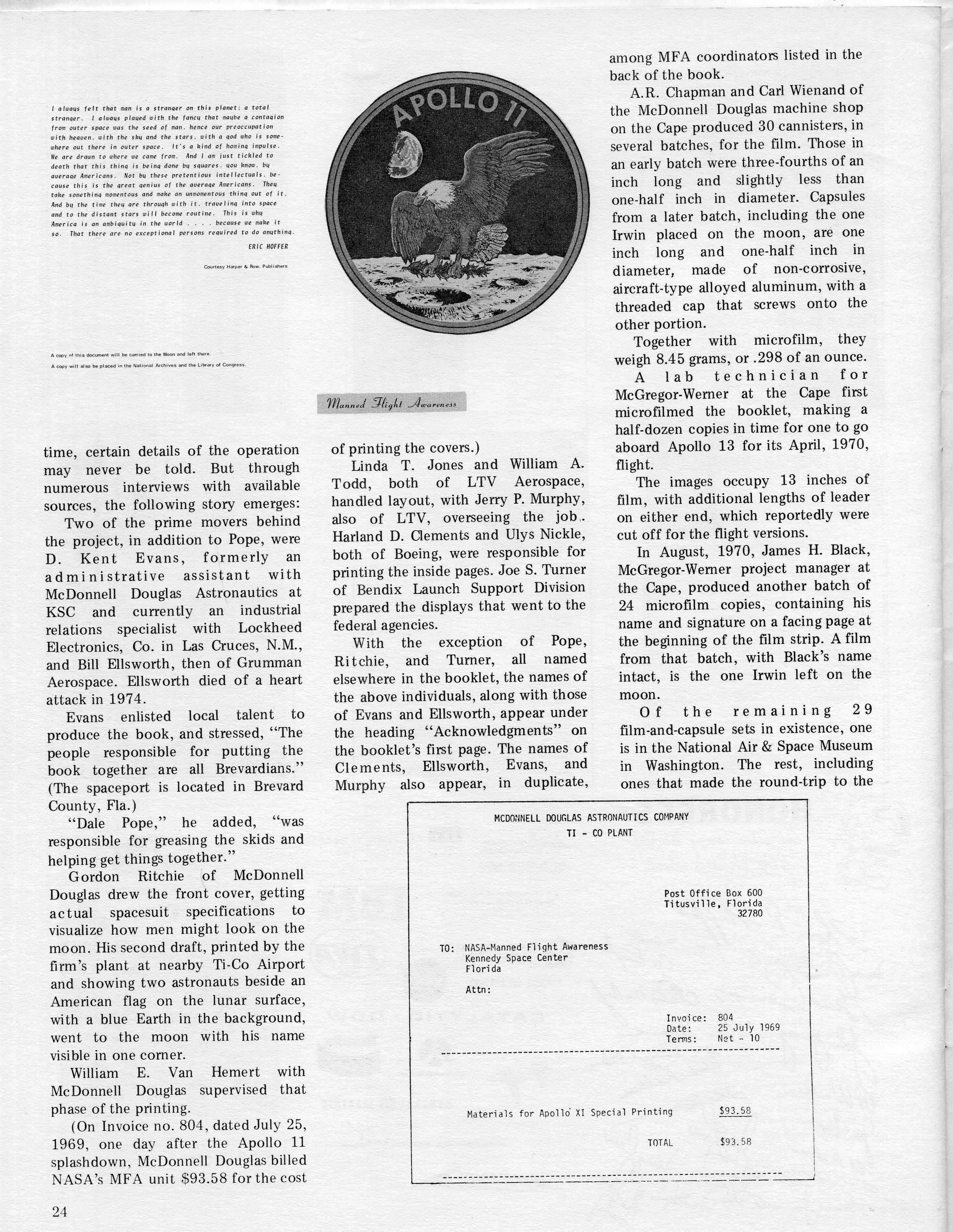 The MFA booklet was produced at the Kennedy Space Center "several months before Apollo 11 ... to honor outstanding industry and NASA workers who contributed to the Apollo man-on-the-moon project through Apollo 11." The article linked below was written by Jerry Lipman and appeared in the December 1976 issue of Space World Magazine. It reproduces the booklet and details how Jim Irwin deposited a microfilm copy of the MFA Booklet on the Moon during Apollo 15. The article is reproduced with permission from the author. Scans provided by Joel Powell. See, also, the discussion related to photos Jim took of the microfilm canister and other memorial items, A15-88-11867 to 11871.
