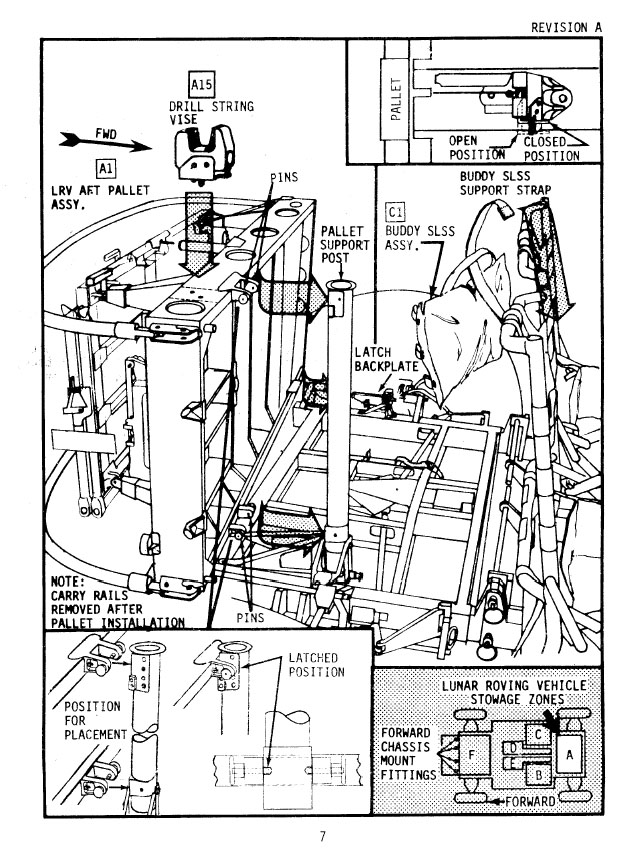 [Jim comes into view at the back of the Rover and goes to the LMP seat. Dave is at the back of the Rover.]164:36:36 Irwin: Okay. Let's see. We don't want the drill on here. What do you want to do with the drill?