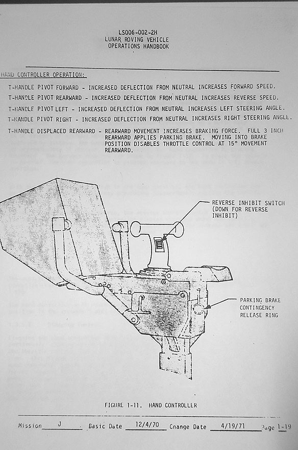 [Figure 1-11 from the Rover Handbook shows the handcontroller. By pulling the handle forward from the neutral position, Dave commands forward motion. The farther forward he positions the handle, the faster their speed. By pivoting the handle rearward from neutral, Dave can put the Rover in reverse. Left and right motions produce turns in those directions.]121:49:41 Irwin: As soon we head upslope, it drops off.