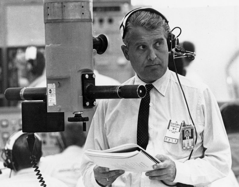 [The accompanying photo shows von Braun following the countdown of Saturn I test flight SA-6 at one of the blockhouse periscopes in May 1964.]