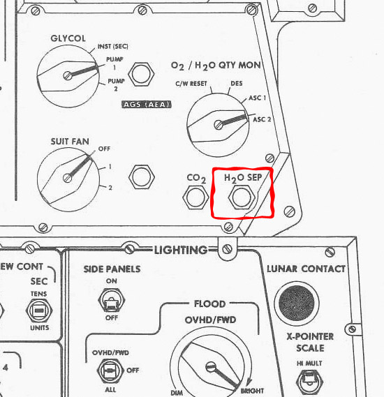 163:25:21 Scott: Okay, caution lamps (to be checked) are PREAMPS and ECS. (Pause) H2O Sep(arator) Component Light's on. "Lower EV visor." On we go.