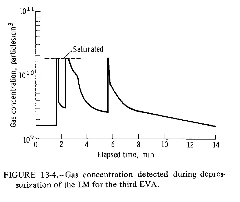 [CCGE data for the EVA-3 depressurization ( Figure 13-4 in the Apollo 15 Preliminary Science Report ) shows peaks at 'elapsed times' of 1:36, 2:17, and 5:38, corresponding to (1) the initial depressurization to 3.5 psi, (2) the second valve opening to complete depressurization, and (3) hatch opening. Although it is tempting to think that zero time corresponds to the reported time of the first valve opening, it seems unlikely that the flow would take 96 seconds to travel 110 meters in the Apollo 15 case versus 30 seconds to travel 190 meters in the case of the Apollo 14 EVA-2 depress. It seems more likely that zero time represents the start of data collection for this event. For the Apollo 15 EVA-3 depress, the relevant mission elapsed times are 163:17:32 for the first valve opening, 163:18:12 for the second opening, and 163:21:35 for hatch open. Dave and Jim did a good job of reporting what they were doing, and the uncertainties in the relative times seems small. The intervals are 40 seconds and 3 minutes 23 seconds, which compare well with the CCGE intervals of 41 seconds, and 3 minutes 21 seconds.]