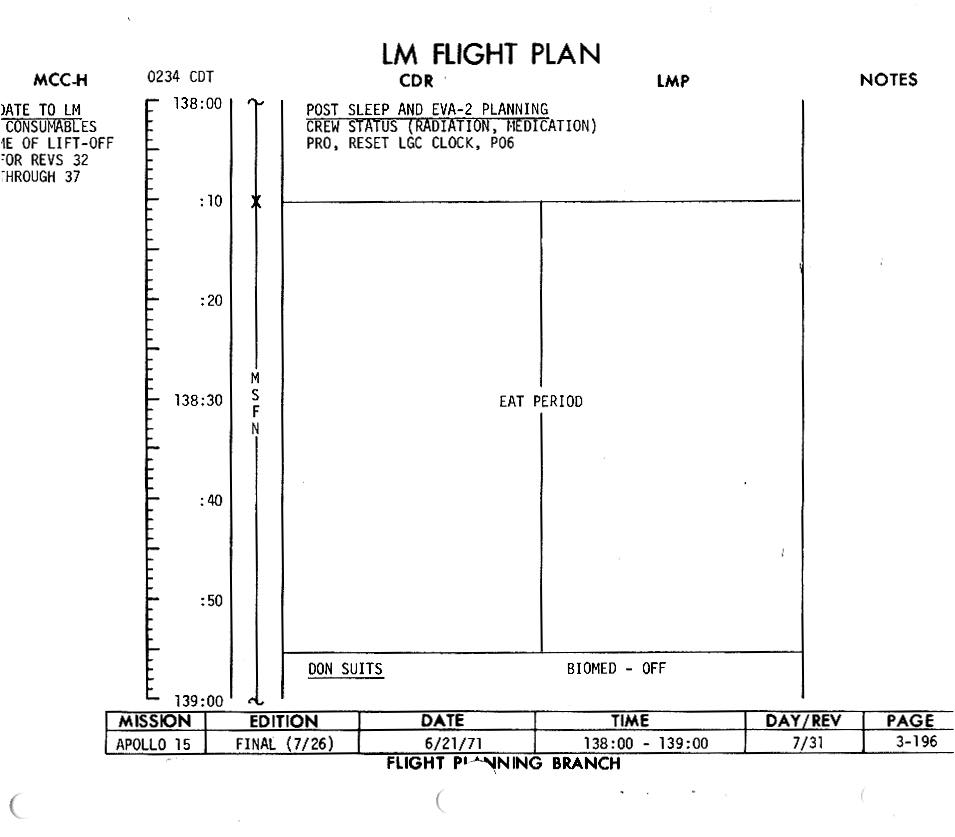 Page 3-196, 138:00-139:00, Post-sleep, EVA-2 planing, eat period (59k; jpg)