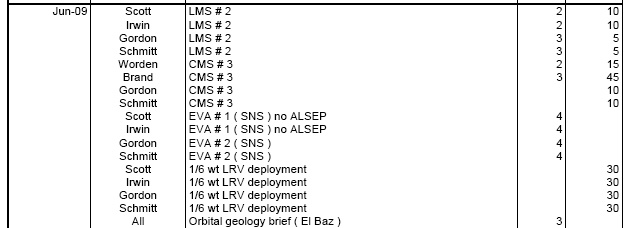 ["Nonetheless, our experience on 12 was excellent. We learned a lot on 12. I mean, Neil was first, but Pete was the ground breaker on a lot of things. And our step ahead (to 15) was mentally to do another 12. Except that, they were going to make the suits a lot better and we were going to get an extended backpack. So we were going to go from a potential - and I'd have to go look at the numbers - from a three-hour limit to, as I recall, a 5 1/2 or 6 hour limit. And we tried to push it beyond that. Actually, our push for expanding our mission was a push to (A) extend the time in the suits and (B) extend the number of EVAs. (To do that), Jim spent a lot of time with the LM. He wasn't the EMU guy, but he'd run LM in the altitude chamber."]