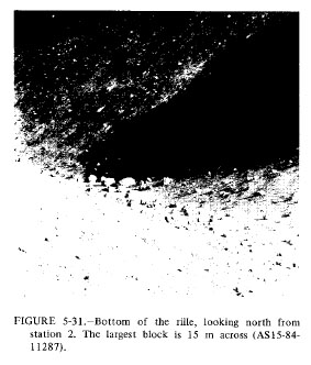 [Jones - "I presume that, in the pre-mission photos, folks thought they could see layers in the rille wall?"]123:20:06 Scott: Okay. And then about one-third of the way down. And there's a nice, big, very interesting outcrop over there, which looks like vertical jointing in a big block with a horizontal layer on the top; the block must be, oh, 2 percent of the rille height and it must be about, oh, twice that across, with the layer maybe one-quarter of the height of the block. And I got a 500 of that. I'll also take you a 500 vertical in the same area.[Scott - "Yeah. I think that's what they are."]