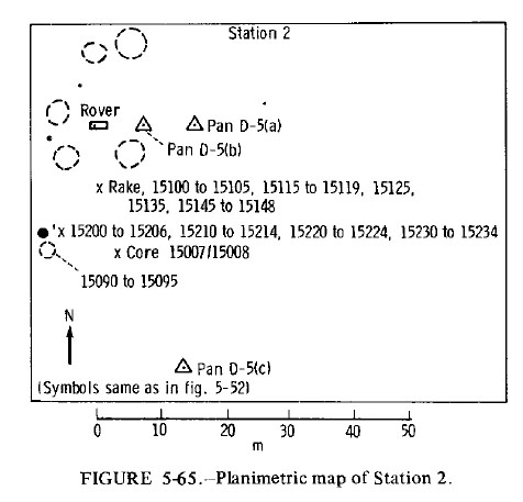 [Jones - "The Station 2 tasks in the procedures document, which is dated July 9, are allocated 45 minutes, which is pretty much what you spent there. I think they shortened Elbow up a little bit and they eliminated Station 3, but they kept the full time at 2. And the tasks listed here, in order of priority, are radial sampling of St. George Crater, slope permitting (see CDR-12). Now you weren't up at St. George at this stop, and you didn't do a radial sample."]