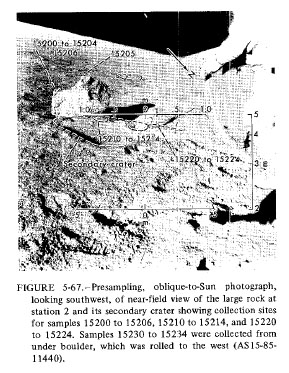 [Scott - "We're not conscious of the television camera. We're off doing this sampling, not realizing that the guys in the Backroom can actually see the rock."]122:41:04 Irwin: It looks fairly recent, doesn't it, Dave?[Scott, from the 1971 Technical Debrief - "It (the boulder) didn't look to me like it came down from above (that is, from higher up on Hadley Delta). I didn't see any tracks (that is, a line of craters and gouges that the boulder would have made had it rolled/bounced/slid down the mountain). My best guess would be that it came from the Secondary Cluster (South Cluster), or was the secondary from below."]