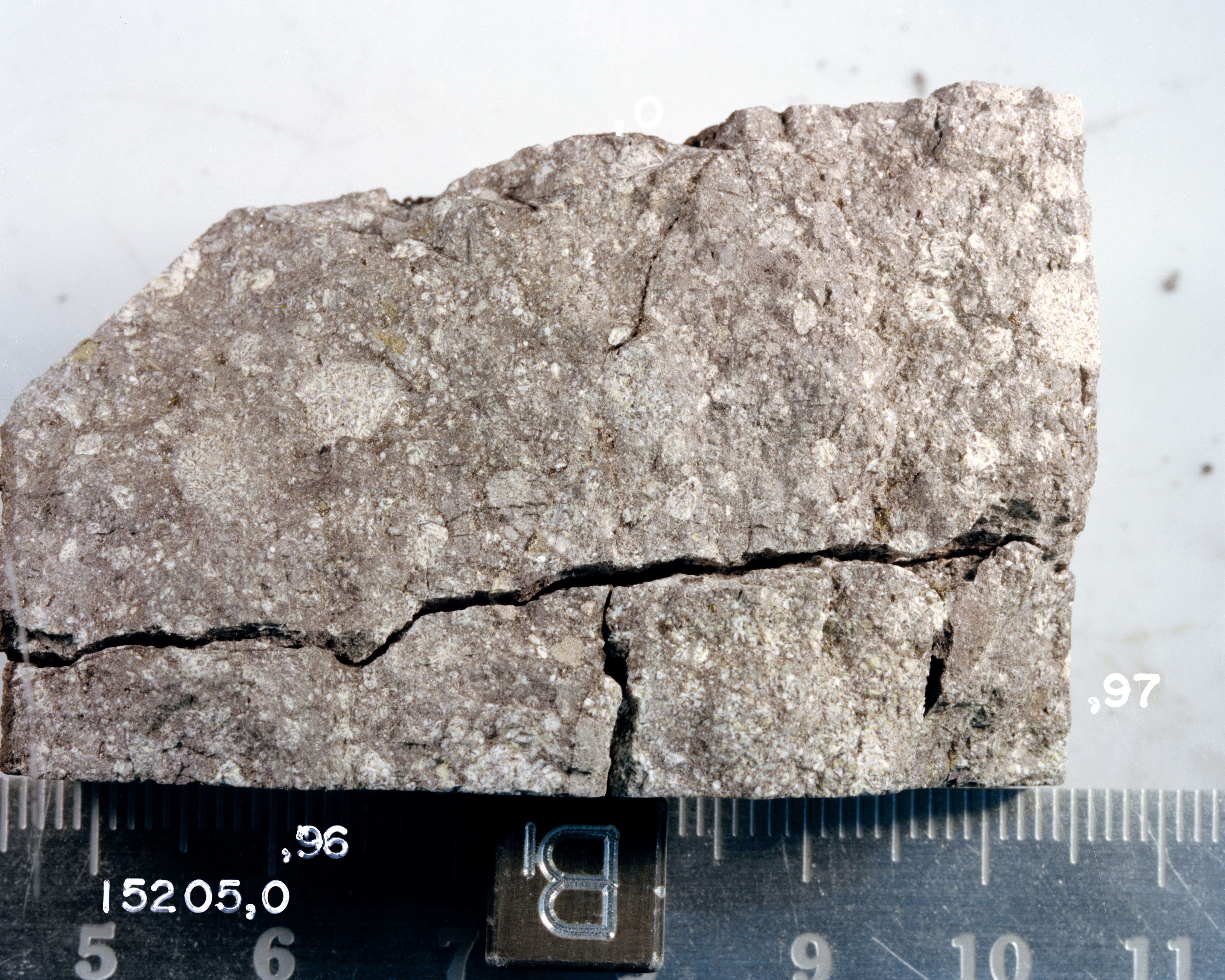 122:38:53 Scott: The most beautiful thing I've ever seen. (Long Pause) Man, we're walking uphill, too! Is that ever uphill! There is one boulder! Very angular, very rough surface texture. Looks like it's partially...Well, it's got glass on one side of it with lots of bubbles; and they're about a centimeter across. And one corner of it has got all this glass covering on it; seems like there's a linear fracture through one side. It almost looks like that might be a contact; it is, within the rock. It looks like we have maybe a breccia on top of a crystalline rock. It's sort of covered with glass; I can't really tell. But I can see a definite linear feature through one side of it which is about a fifth, and the glass covers both sides of what I guess I'm calling a contact.