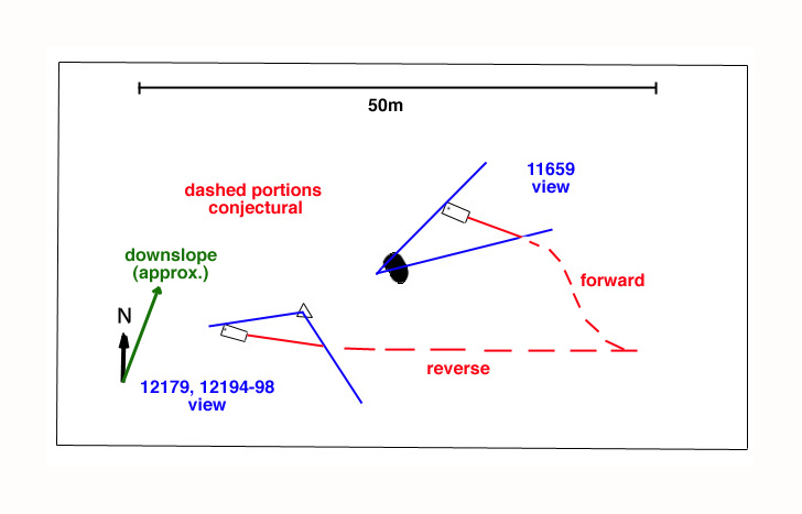 [The remaining frames of this first part of Jim's pan 12189 to 12193 show the inbound Rover tracks. As mentioned previously, in 12192 and the others, we see tracks made by all four wheels because of the slope.]