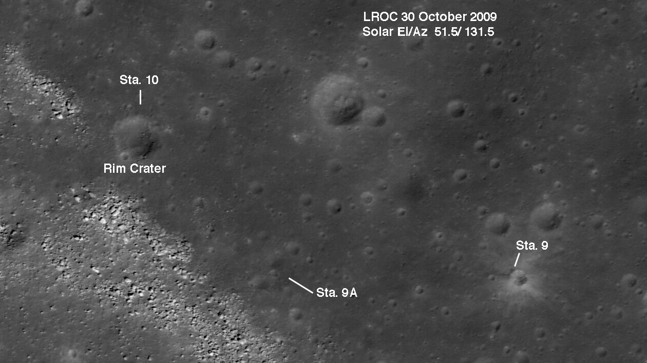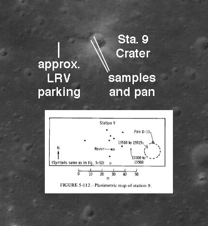 [These readouts indicate a position of about BS.4/66.6. According to the Apollo 15 Preliminary Science Report ( 51 Mb ). They have parked on the rim of a crater 15 meters in diameter about 75 meters south of the rim of Scarp Crater. That would put them close to BR.8/66.9 and gives credence to Dave's observation 166:38:34 during the drive back to the LM at that the Nav system was "biased right" by about 8 degrees. If we subtract 8 degrees from the bearing, the implied position is BR.5/66.7, in good agreement with their actual location.] [When an LROC image of the site was taken on 30 October 2009, the Sun's elevation of 51.5 degrees was high enough to show that the Station 9 crater is very fresh, surrounded by a bright ejecta blanket. Scarp Crater does not show up well at this high Sun angle; but it shows up well in a labeled detail from an LROC image taken on 13 July 2009, with the Sun low in the West.]165:02:28 Scott: Got off okay? Good.{A second detail from the October image has been combined with the planmetric station map from the Preliminary Science Report ( 51 Mb ) to show the LRV parking spot and the places where Dave and Jim will collect samples and take a pan. The planimetric map has been scaled to match size of the drawn crater to the actual crater.]