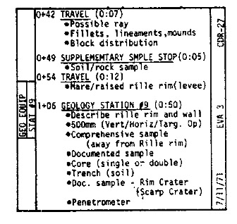 [The planned Station 9 tasks are listed on CDR-27 but are more appropriate to a stop at the edge of the rille.]165:05:05 Scott: I think I'll get to work here and...