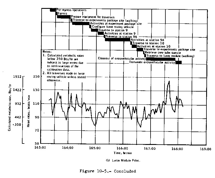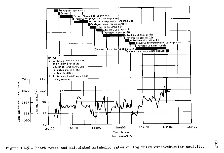 [Sometimes, a request for an "EMU status check" is, in fact a request that the crew slow down and take a breather. Here, it is a real request because Dave and Jim have just gotten off the Rover after a restful drive. As indicated in Figure 10-5 from the Mission Report, Dave's heart rate dropped into the mid-60's during the drive and Jim's dropped to about 80. Neither of them will reach particularly high heart rates during this EVA.]165:03:28 Scott: Yes, sir. I've got clear flags about 74 percent, and 3.85.