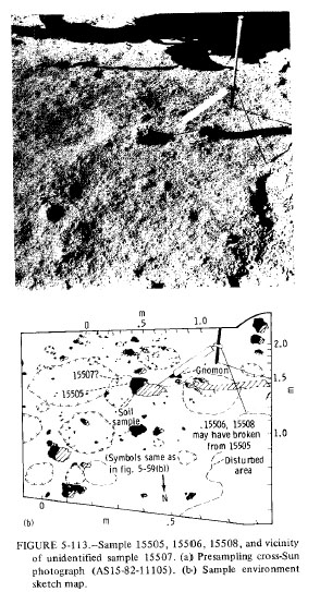 [Fendell reaches the clockwise pan limit without finding Dave and Jim. They are hidden by the seats and the geopallet. In the distance beyond and just to the left of Jim's seat, we see a considerable amount of blocky ejecta at the crater rim and, in the far distance, the Swann Range with some outcrops evident on the mountain side just south of the southern flank of Mt. Hadley. Fendell zooms in on the mountains. Dave's photo AS15-82- 11078 shows the area in question as seen from the north rim of the crater.]165:10:56 Irwin: You know, this has the appearance of those small ones that we sampled, with the exception (that) there's no concentration of glass in the very center. Instead every fragment has glass on it.[While Jim gets a sample bag ready, Dave takes a stereopair of cross-Sun "befores" of the "nice big one", AS15-82- 11105 and 11106. Note Jim's shadow across the top of the pictures. Figure 5-113 from the Apollo 15 Preliminary Science Report is a pre-sample sketch map based on 11105. the sample is 15505, an 1147-gram regolith breccia. Another, slightly larger sample is 15558, a 1333-gram regolith breccia with similarities to 15505, also may have been collected at Station 9.]