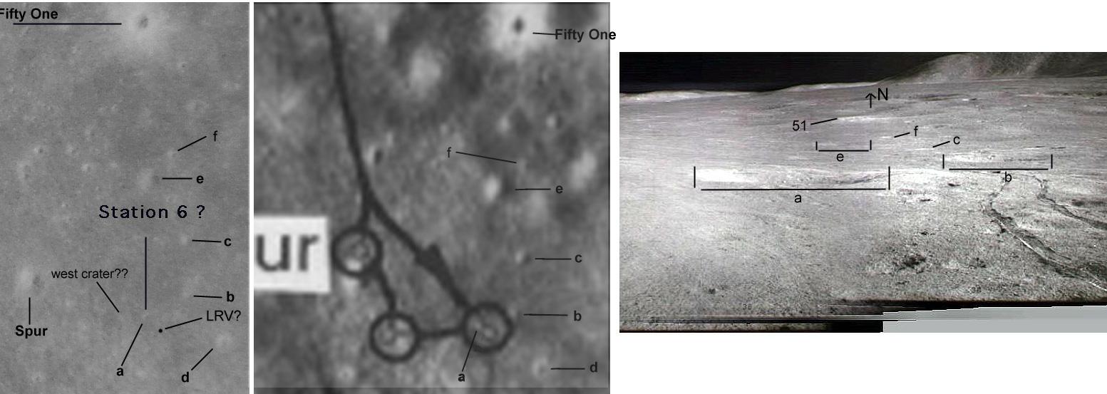 [With the LM on a bearing of 343 at a range of 5.0, they are near AY.3/79.1. They are actually closer to AY.7/79.2.][Rattee - " I've attached a three-image montage made from details from two Pan Camera frames and a portion of Jim Irwin's first Station 6 pan. I've labeled the common features in all three (as best as I could figure for the pan portion). If my interpretation of the Station 6 location is correct, the Pan Camera frames show what appears to be a roughly 40m crater about 80 m to the ENE of the Station 6 crater. This is what I call crater 'b'. Irwin's pan appears to show this feature, though distance and therefore crater size is near impossible to nail down from the moderate resolution jpg's. In Irwin's second pan taken west of the Rover, crater 'b' is not evident because I figure crater 'b' is hidden behind crater 'a'. It is possible that crater 'b' is the one Scott to refers at 144:38:42: 'I'd suggest that we drive on down to that white crater and take the 500's from there.'? As well, crater 'd' could be the crater Irwin refers to at 143:53:49, just seconds before stopping during the drive north around the east side of the sta. 6 crater: 'There's one of those very fresh craters over at 11 o'clock'. I can't identify crater 'd' in Irwin's first pan because it is up-Sun and beyond the Rover and, therefore, difficult to spot."]