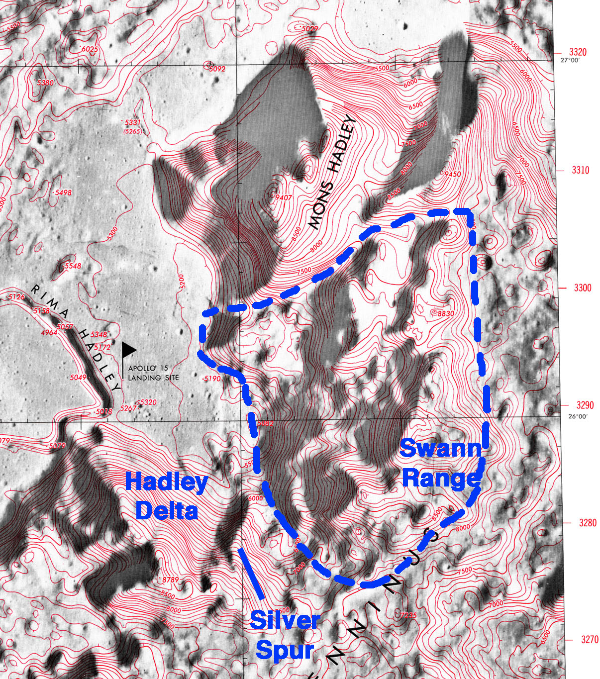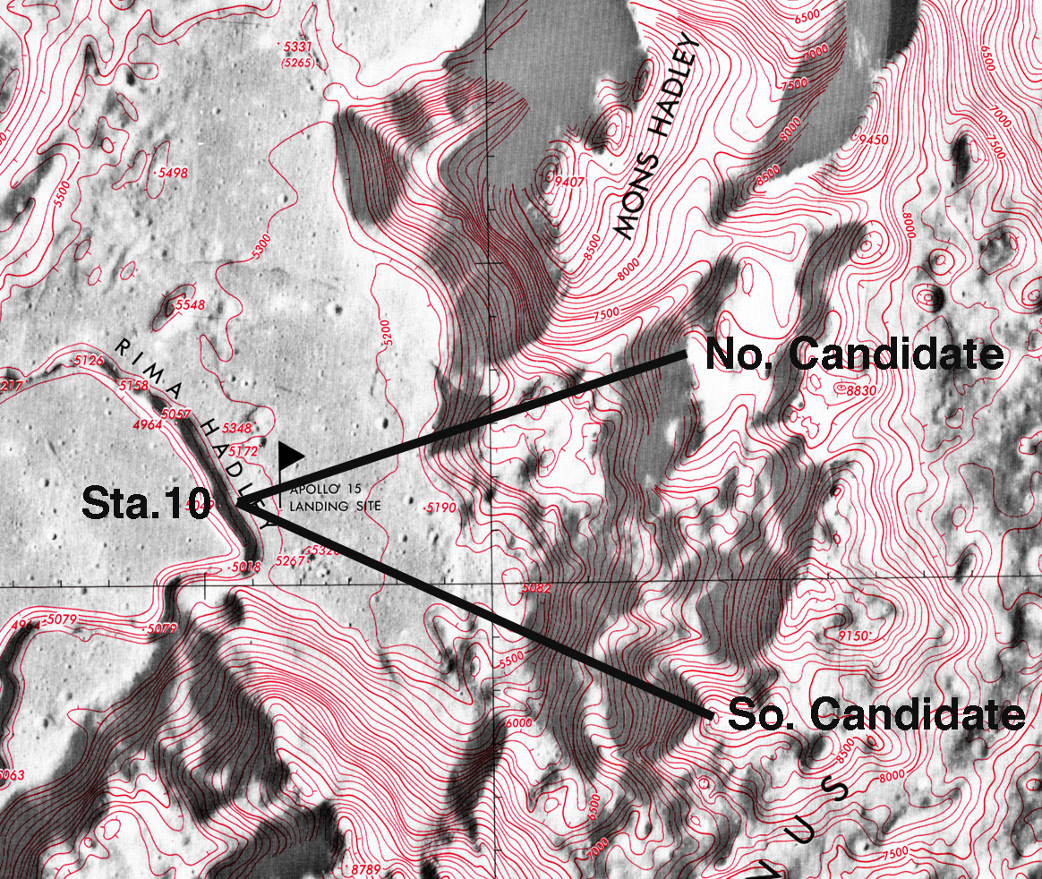 However, based on the clear evidence of Jim's description during the drive back from Station 10, I believe that Jim was applying the name Big Rock Mountain to one of the summits in the Swann Range. Certainly, Jim was not describing Mt. Hadley. In addition, I am not aware of any instances of the Apollo crews giving new names to previously named lunar features. Because of a conflict with the International Astronomical Union over names chosen by the crews for previously-unnamed features that raged throughout the Apollo years, I doubt that the crew would have seriously considered weakening their asserted naming rights by proposing to rename so prominent a feature as Mt. Hadley. Based on the evidence in hand, I believe the northern candidate more closely matches Jim's description than does the southern candidate.
