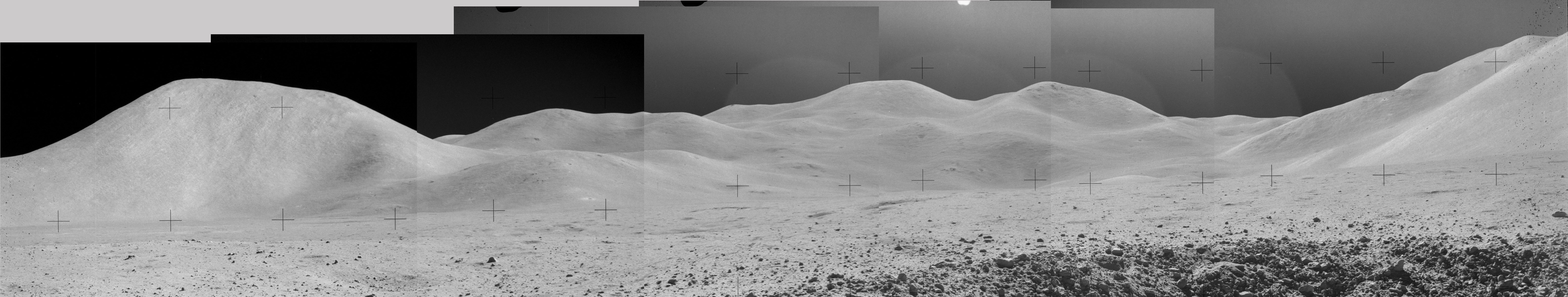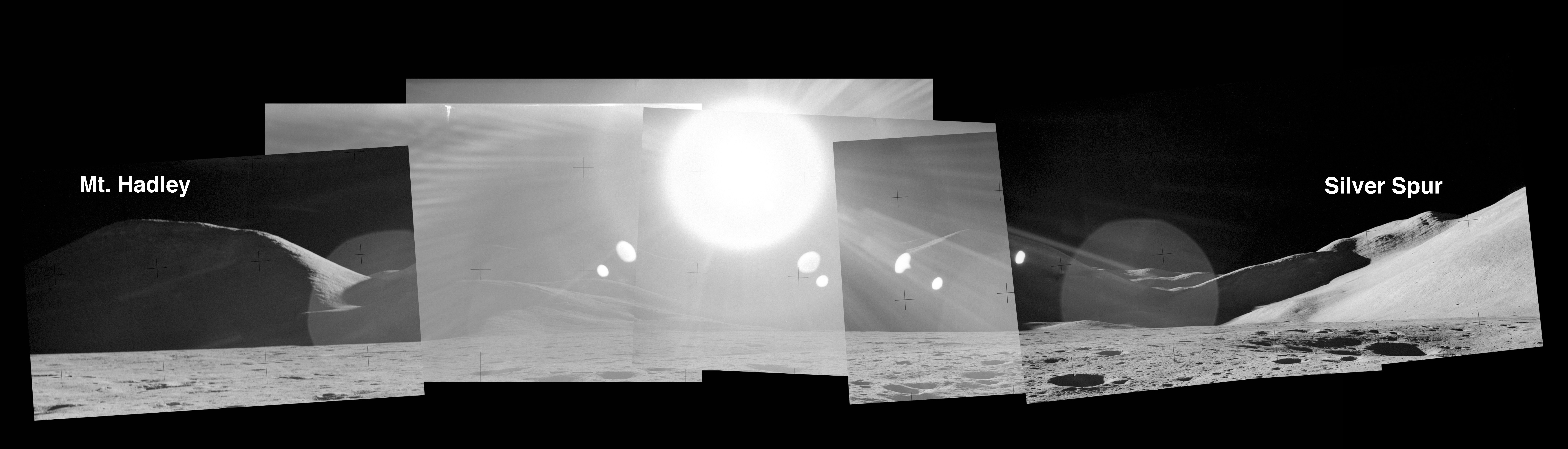 166:32:32 Irwin: We're looking directly east now as we head back to the LM...Did you put your visor down?Because Station 10 is near the rille rim and, therefore, is below the level of the mare surface, Jim's Station 10 pan doesn' t show the base of the mountains to the east. However, Dave's Station 9 pan is a good subsitute, having been taken on the mare surface only about 400m ESE of Station 10 and only about 90 minutes earlier.166:32:38 Scott: Haven't yet, but I think I just might.