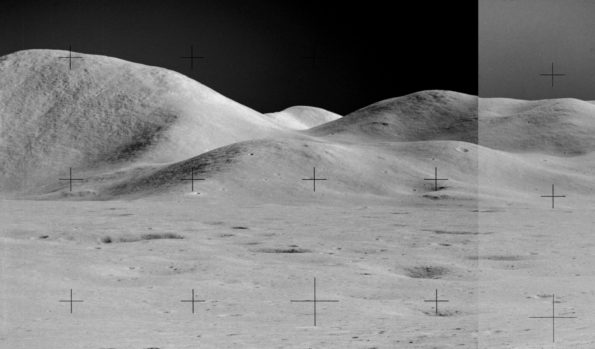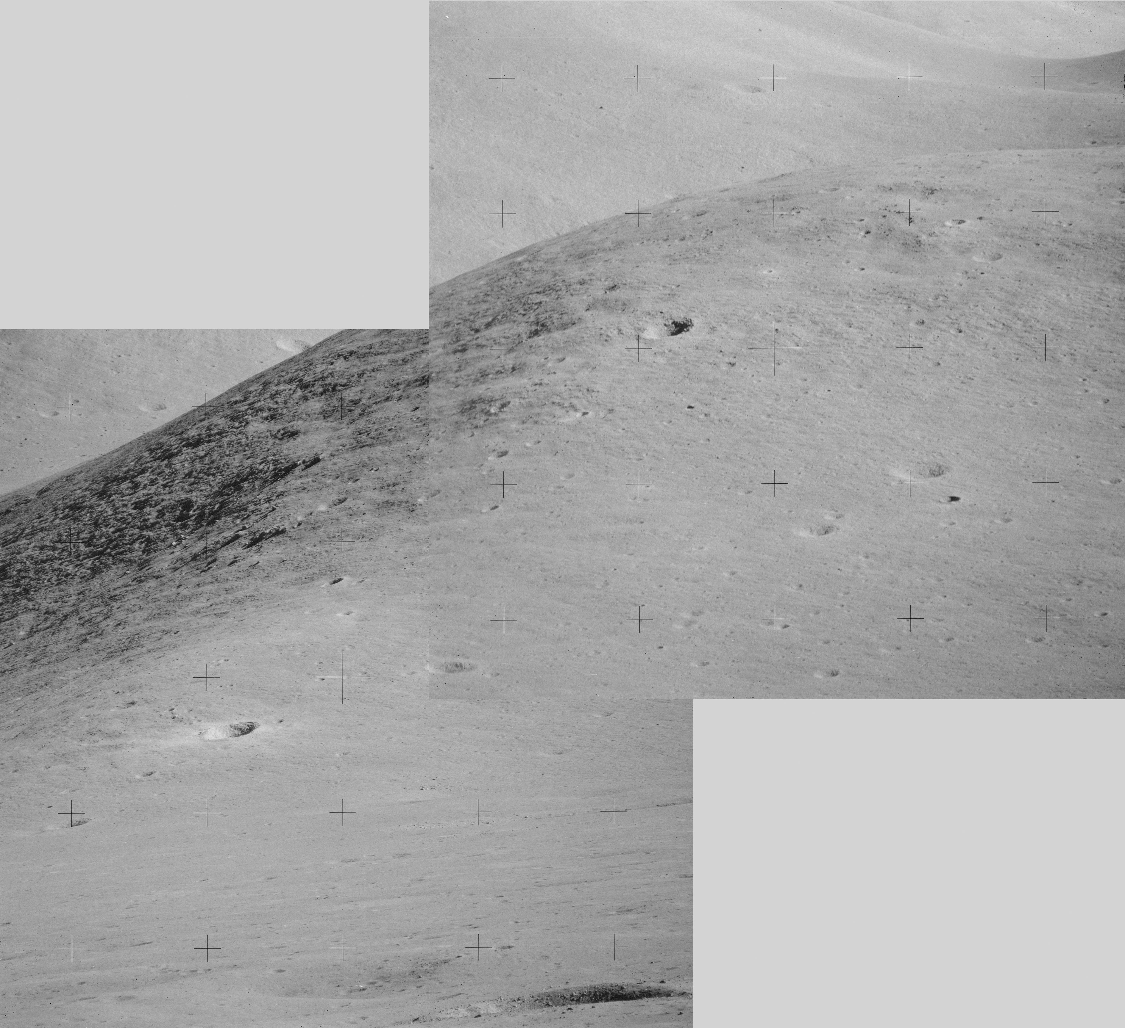 144:50:48 Scott: Okay, Joe, I got the 500 pictures. And I took, first, Mount Hadley; two horizontal strips up at the top where there are some outcrops, and probably the only two craters that I can see on the side of any sizable size. And then a vertical strip through one of the outcrops, and a vertical strip through another outcrop, and then two craters that are in, I guess, what we'd call the forward, leading edge of Swann Mountain over there, which are quite prominent craters. And then I swung over to a bright fresh one that we see, oh, to the northwest, way out. And then I turned back around to Hadley Delta and shot upslope at Hadley Delta, and picked up the debris that seems to be exposed up on the top of Hadley Delta. And now the frames say 120.