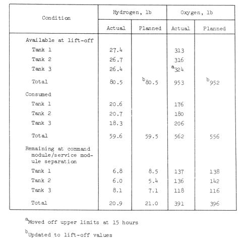 throughout the mission. The quantities of oxygen and hydrogen consumed as