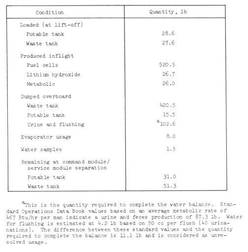 The water quantities loaded, produced, and expelled during the mission