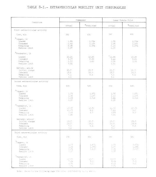 Oxygen, feedwater, and power consumption of the extravehicular mobility