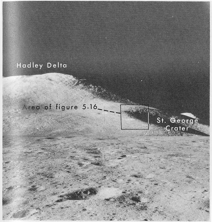 FIGURE 5-15. View south toward Hadley Delta (approximately 3.5 km high) showing the northeast-trending lineament set (sloping gently left) and the north-trending lineament set (sloping more steeply to the right). The cluster of small fresh craters on lower slope of Hadley Delta at left side of photograph is noteworthy (AS15-85-11374).