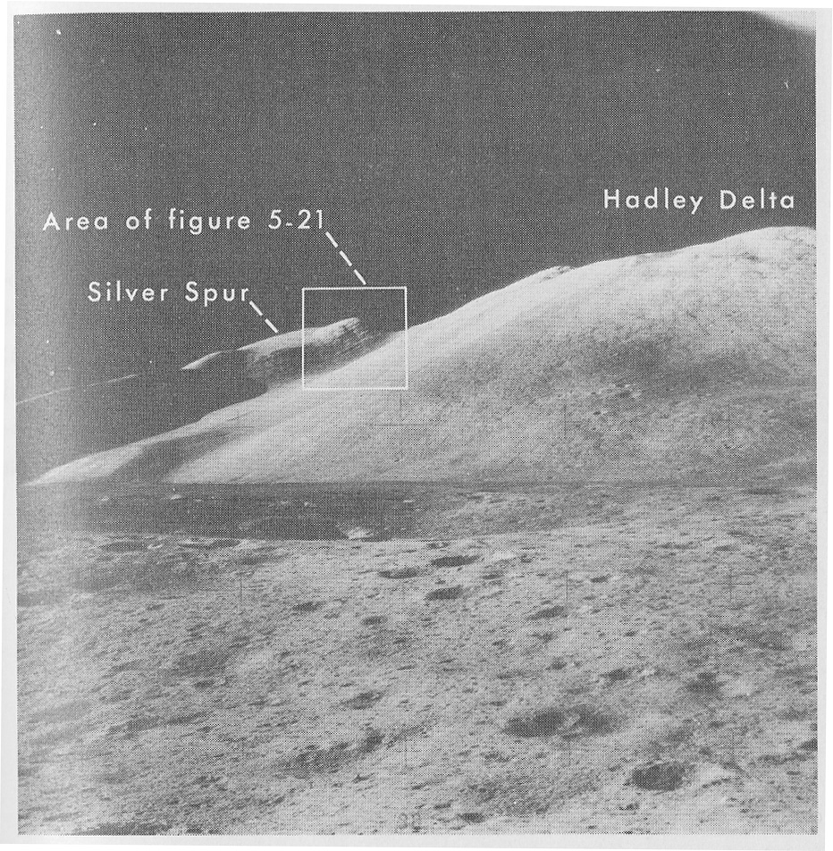 FIGURE 5-20.-View looking southeast to HadleyDelta and Silver Spur showing the Silver Spur ledges with a gentle apparent dip to the left. Hadley Delta is approximately 3.5 km high and the distance to the crest of SffverSpur is approximately 20 km (AS15-85-11371).