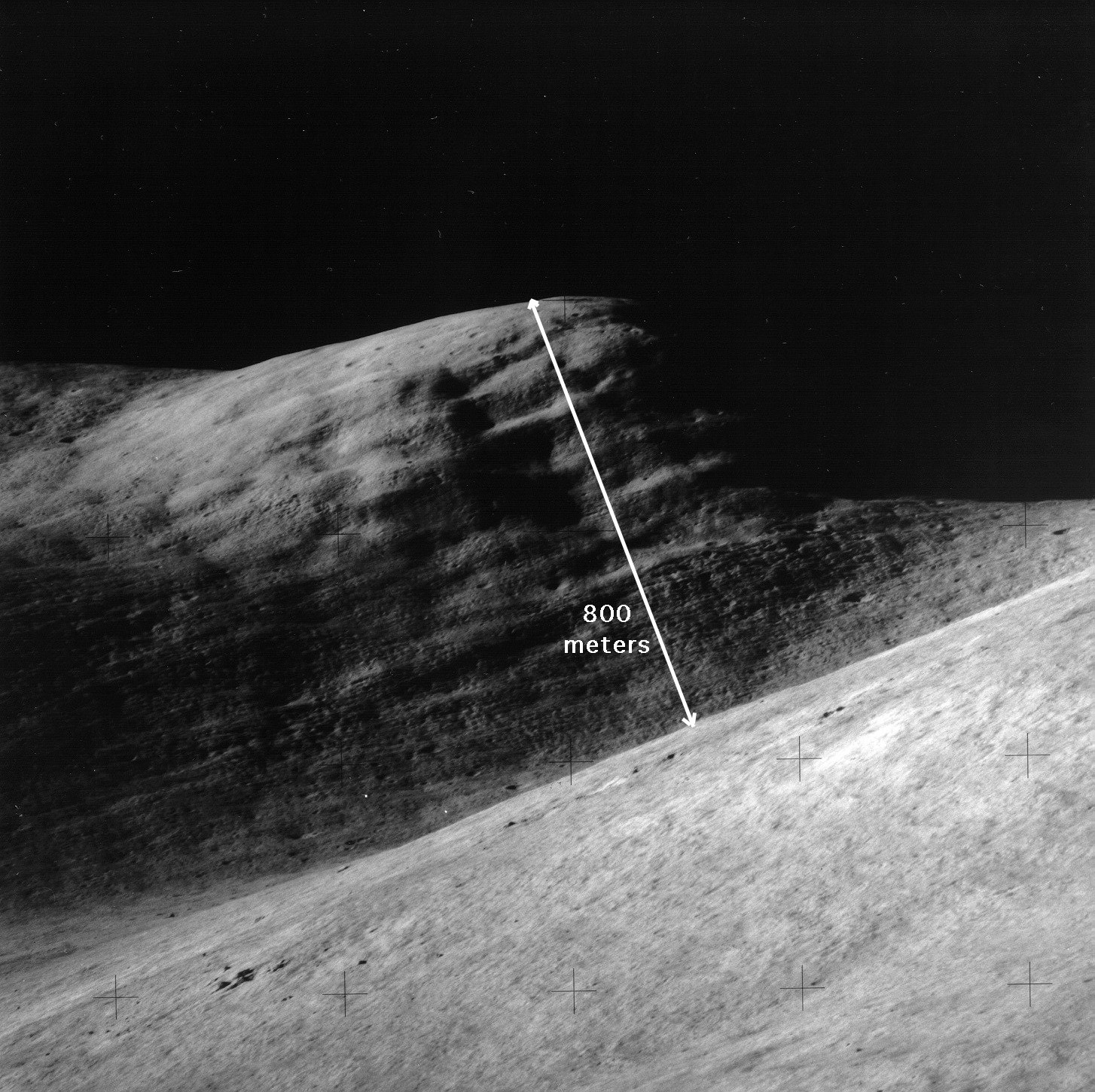 FIGURE 5-21.-Lunar-surface 500-mm photograph looking southeast toward SilverSpur, approximately 20 km away. View shows detail of massive ledges of the north-northeast lineament system (sloping gently left) and the possible fractures of the northwest lineament system (dark deeply shadowed depressions sloping steeply right), Slope of Hadley Delta is in the foreground ( AS15-84-11250 ).