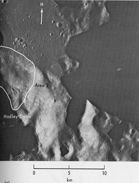 FIGURE 5-23.-Lineament azimuth-frequency plot and location map of area 2. Scale represents number of lineaments plotted as a function of distance from origin; lineaments are plotted in 10¡ increments.(a) Orbital panoramic camera view taken with low Sun (pan AS15-9375). (b) Plot of area 2 (252 lineaments)
