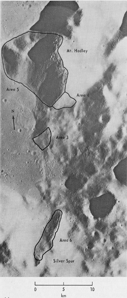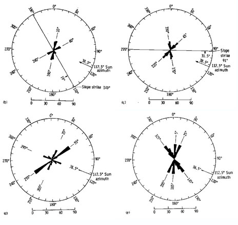 FIGURE 5-24.-Lineament azimuth-frequency plots and 1ocation maps of aleas 3 to 6. Scale represents number of lineaments plotted as a function of distance from origin; lineaments are plotted in 10 ¡ increments. (a) Orbital panoramic camera view taken with intermediate Sun (pan AS15-9425). (b) Plot of area 3 (1081ineaments). (c) Plot of area 4 (107 lineaments). (d) Plot of area 5 (166 lineaments). (e) Plot of area 6 (189 lineaments).