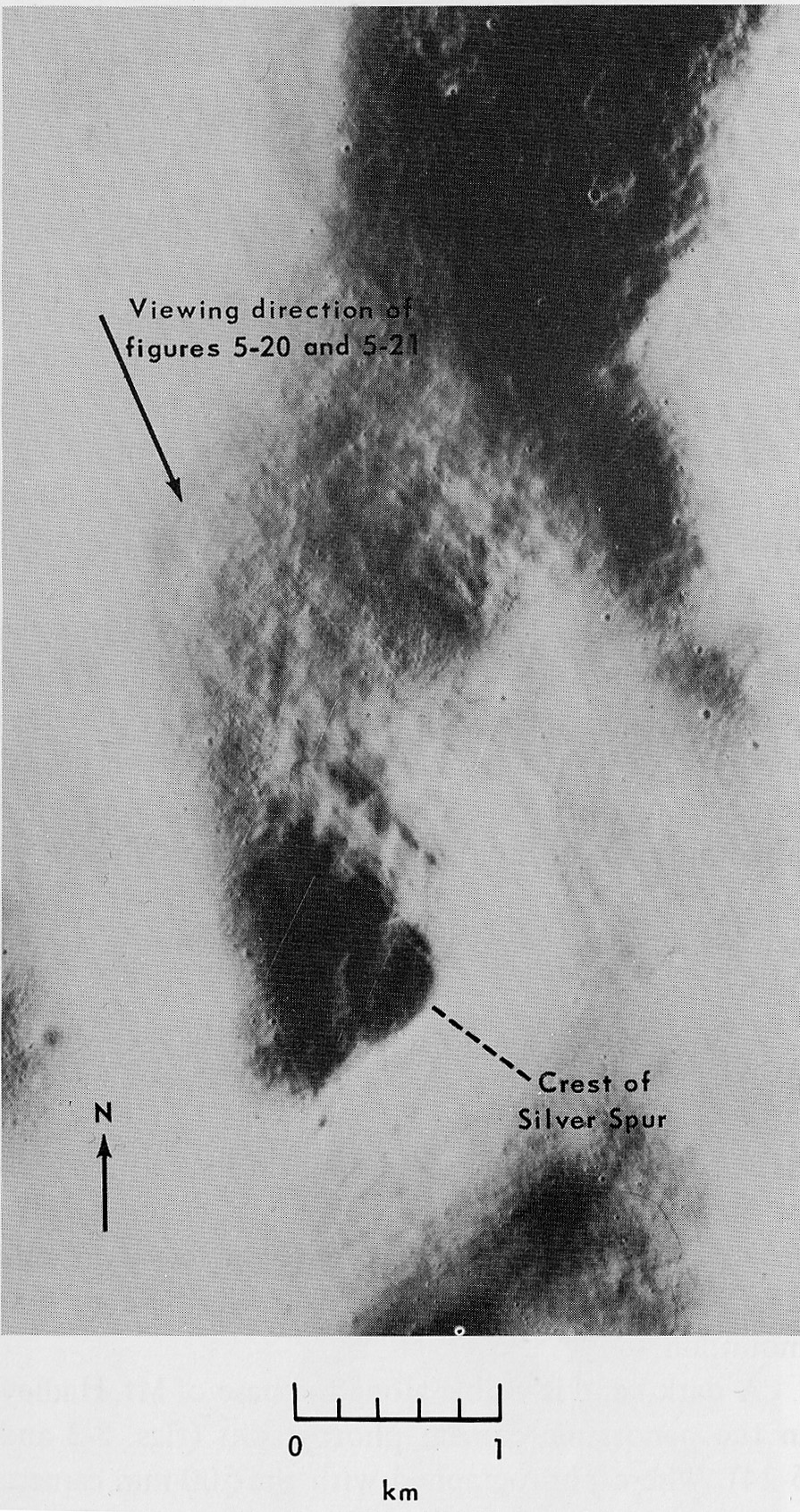 FIGURE 5-25.-Approximately vertical view of Silver Spur showing the diamond-shaped topographic pattern related to intersection of two sets of lineaments (pan AS15-943O).